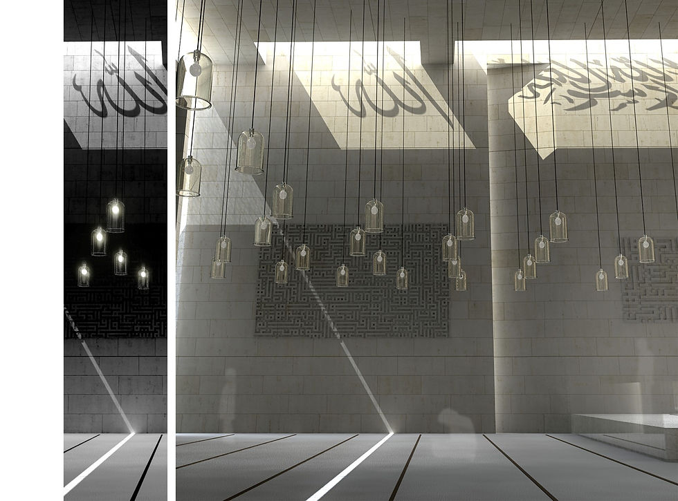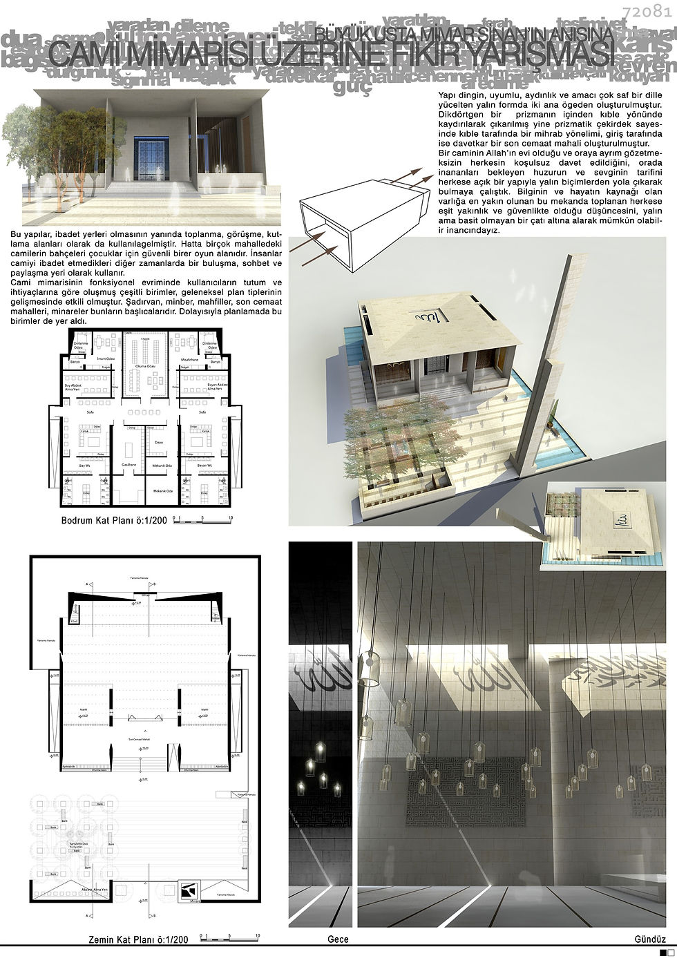 The mosque is formed by two simple forms which reflects the serenity, harmony, brightness and pureness. With the prismatic core that is created by sliding the mass through kiblah direction, a mihrab orientation on the kiblah side and the narthex on the entrance side is created. Thus, a scheme which didn't go far from the traditional plan type is emerged. The gathering-place on both sides of the entrance are also taken as a reference.